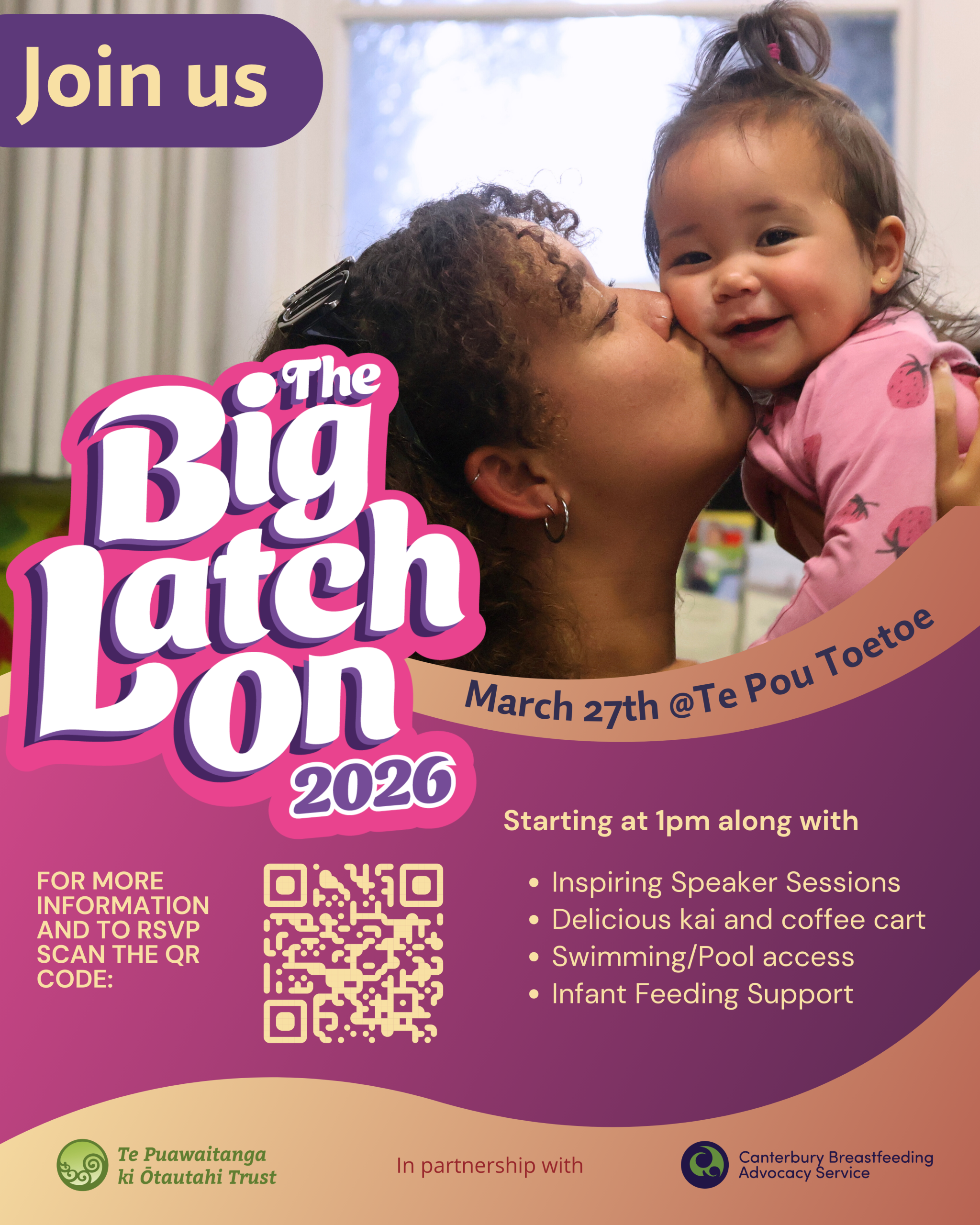 Nau mai, haere mai ki te Big latch On!  We have listened to the hapori, and are pleased to present the Canterbury Breastfeeding Big Latch On 2026! This is a FREE community event held at Te Pou Toetoe (Linwood Pools) that aims to normalise, protect, and promote infant feeding in Waitaha. This year, here’s what’s on offer: Free coffee cart (1pm - 3pm) Guest speakers and infant...